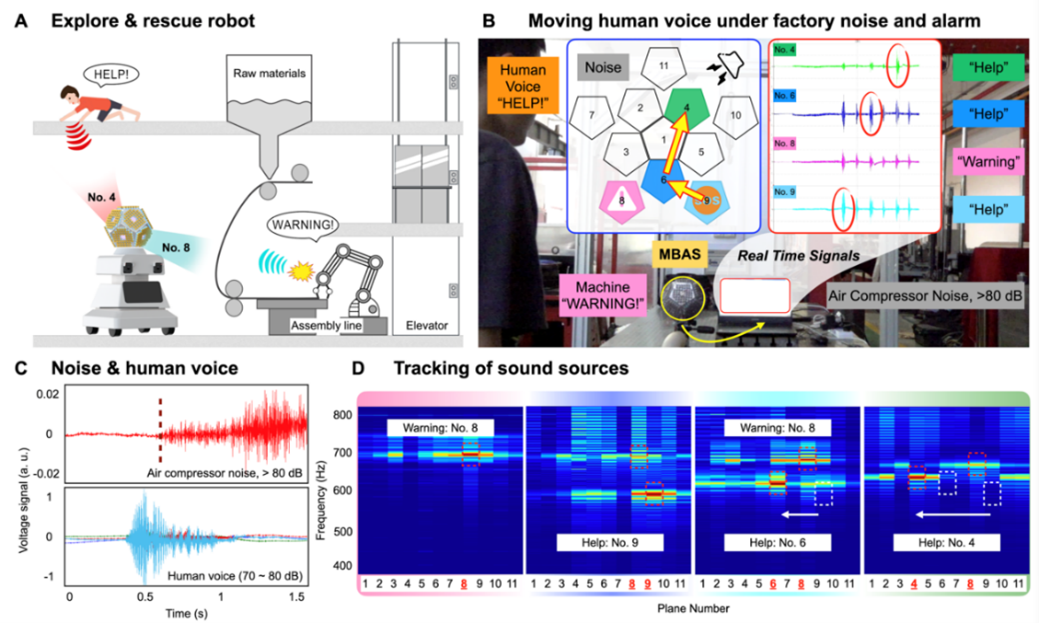 同时,基于缺陷腔阵列,结合波束形成算法和机器学习算法,研究团队还实现了多个声源的实时定位和追踪,并展示了线上会议协助和工厂巡逻搜救等多个应用场景下的强大功能。声学超球面系统不仅成功识别了空间内相邻角度同时发声的多位用户,还可以追踪被强烈背景噪音淹没的人声。即使是空间内多个相邻角度声音信号严重混杂的情况下,声学超球面也可以基于归一化能量图谱来分辨不同的声源信息和所在方位。