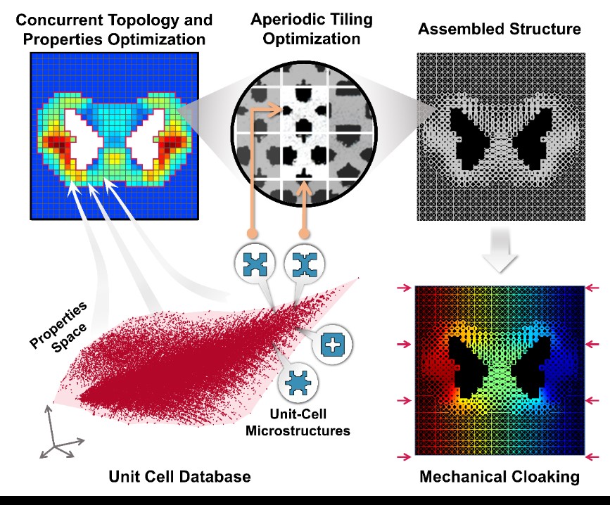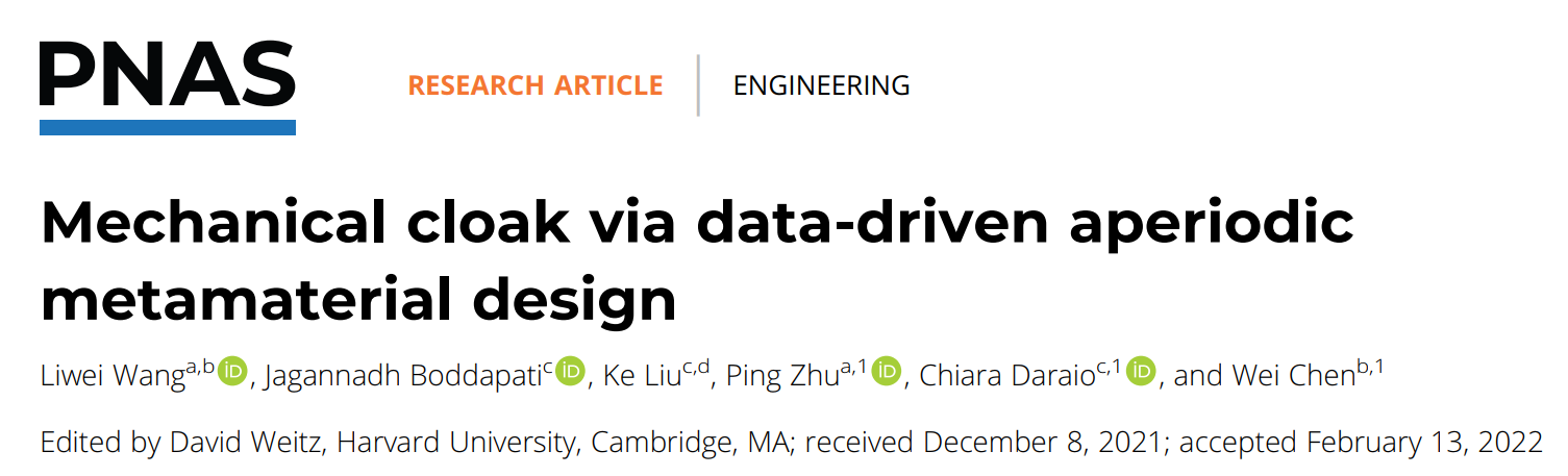 近日,上海交大365best体育亚洲官网朱平教授、美国西北大学Wei Chen教授及美国加州理工学院Chiara Daraio教授合作团队,在《美国科学院院报》(PNAS:Proceedings of the National Academy of Sciences)上发表研究成果“Mechanical Cloak via Data-Driven Aperiodic Metamaterial Design”,利用数据驱动的方法设计非均质的超材料结构,获得了优异的力学隐身性能,为更为普适的力学隐身衣设计提供了一条有前景的新路径。朱平教授和Wei Chen教授联合培养的365best体育亚洲官网2017级致远荣誉计划博士生王力为是该论文的第一作者,朱平教授、Prof. Wei Chen与 Prof. Chiara Daraio为论文的共同通讯作者。