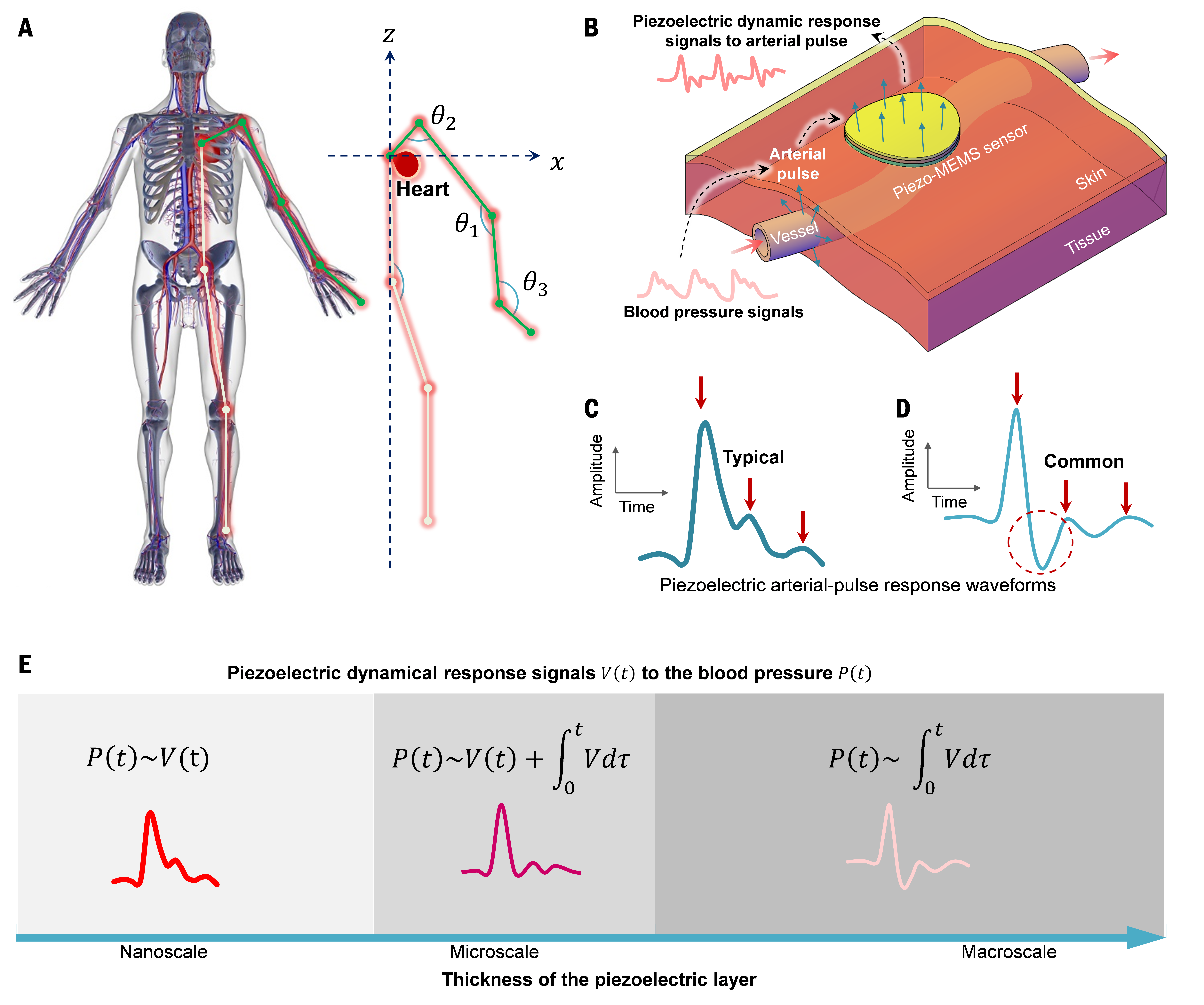 近日,365best官网张文明教授和电子信息与电气工程学院杨斌教授合作团队,在Advanced Materials发表研究成果,从人体血液动力学和柔性压电动力学基础出发,提出了人体动脉脉搏压电动力学分析新方法,揭示了压电脉搏波与人体血压波之间完善的映射关联关系,突破了柔性MEMS压电传感在连续血压监测方面关键技术瓶颈,为穿戴式血压监测领域的发展提供了新的途径。论文第一作者是博士后易志然,通讯作者是张文明教授和杨斌教授。
