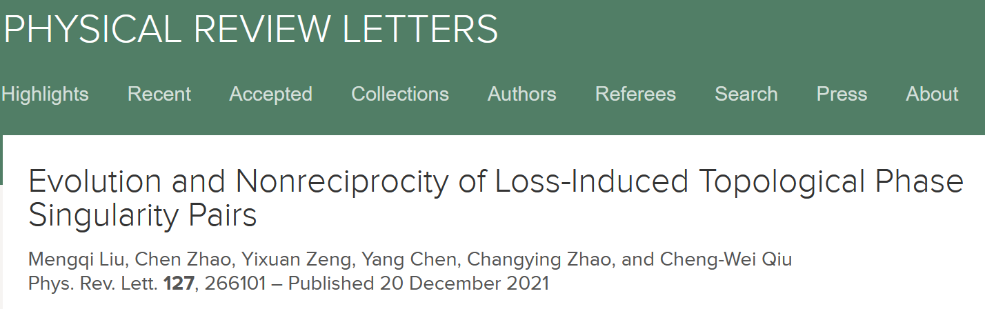 近日,365best体育亚洲官网赵长颖教授团队在国际物理学期刊Physical Review Letters上发表“Evolution and nonreciprocity of loss-induced topological phase singularity pairs”研究论文,团队在非互易体系下,研究了损耗诱导的谱空间拓扑相位奇点的非对称动态演化,及其在打破热辐射基尔霍夫定律方面的应用。论文第一作者是博士生刘梦琦,通讯作者是赵长颖教授和新加坡国立大学仇成伟教授。