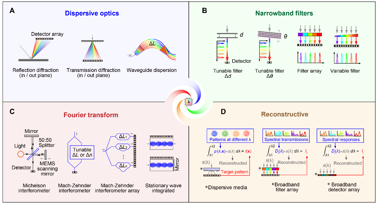 光谱仪是科学研究和工业应用中最常用的测量工具之一,可表征物质的特征光谱,从而对其成分及结构进行分析。传统的光谱仪结构复杂,体积庞大,且便携性较差,而光谱仪的微型化引起了广泛关注。论文全面总结分析了过去三十年中所发展的四种微型光谱仪,即色散型(dispersive optics)、窄带滤光型(narrowband filters)、傅里叶变换型(Fourier transform)和计算光谱(reconstructive)四大类。