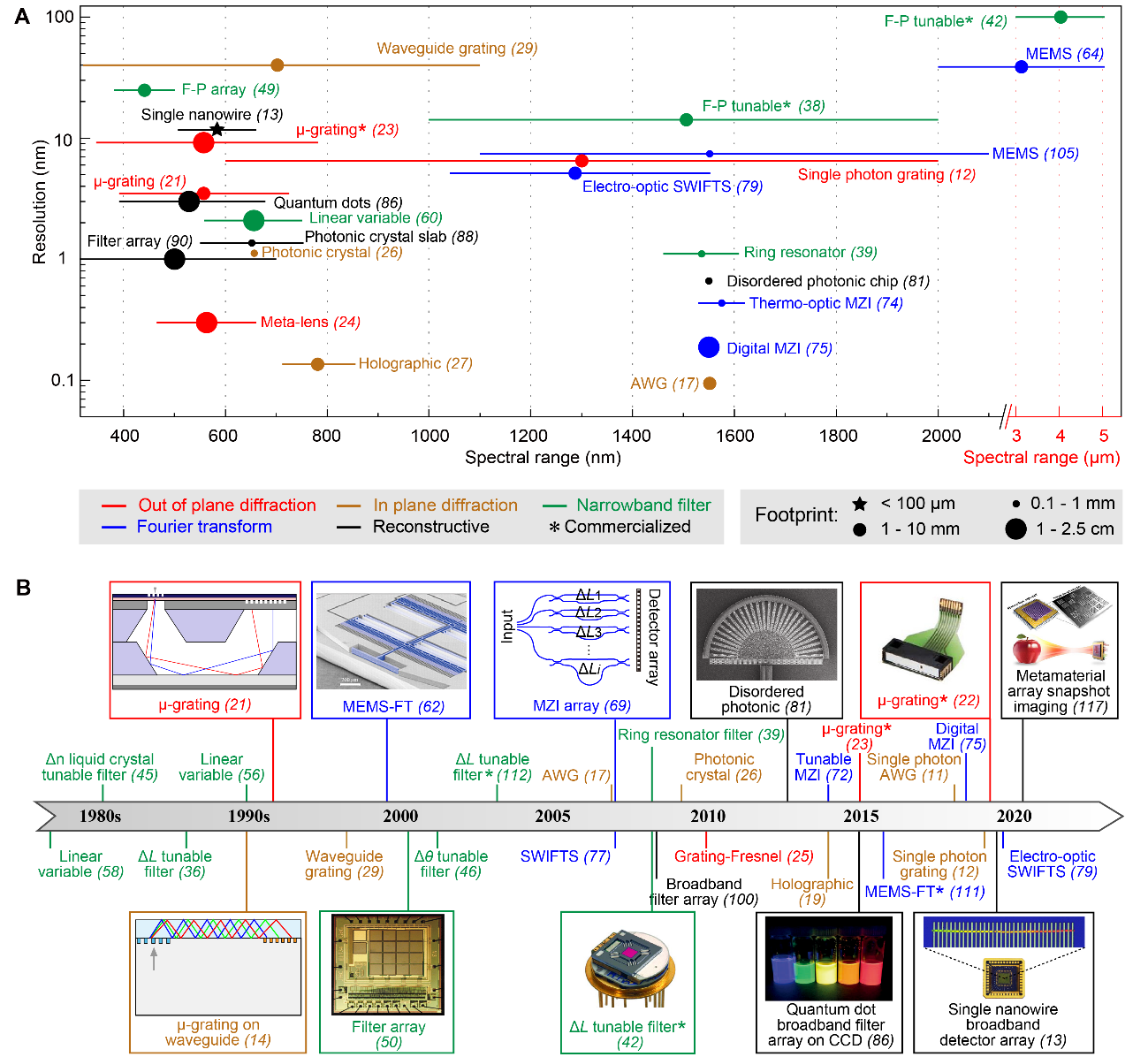 论文指出了微型光谱仪发展历程中的重要技术突破,认为微型光谱仪的发展主要依赖于加工技术的进步和计算能力的提升。早期微型光谱仪的发展主要利用了20世纪80年代到21世纪初微制造领域的突破,光刻和蚀刻工艺的进步、MEMS技术的持续发展使得复杂的微型色散器件、滤光器件和傅里叶变换系统的制造成为可能。过去十年,计算能力的大幅度提升、计算成本的大幅度降低、压缩感知和深度学习等数学工具的发展为微型光谱仪的改进注入了新活力。目前,计算光谱仪已成为最具发展前景的技术,相关研究人员相继提出了一系列新型光谱仪如量子点光谱仪、超表面光谱仪等。