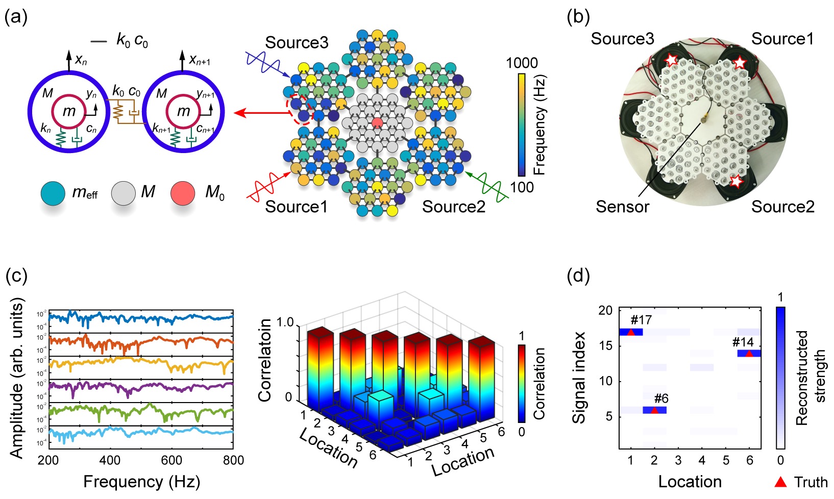 在自然界,蜘蛛可以灵敏感知和定位落在蛛网上昆虫的振动。像蜘蛛一样利用传感器对远处的振动激励进行感知和定位即为振动溯源,在医疗健康监测、机器故障诊断、智能设备和物联网等领域具有重要的应用价值。传统的振源辨识技术通常依赖于多个分布式传感器或传感器网络,测试系统复杂且功耗较高。为了突破传统振源辨识技术受传感器数量限制的瓶颈难题,何清波教授等人利用超材料结构的原理,提出了振动传递特性设计和调控的思想。超材料是一种自然界不存在的人工复合材料,具有超常的动力学特性。一般超材料具有周期性复合结构,比如局域共振超材料,但是周期性超材料结构难以对来自多个方位的振动传递特性进行灵活调控。研究人员提出了随机耦合振子动力学理论,建立了一种融入等效负质量特性的动力学分析方法,以此指导设计了随机耦合局域共振超材料结构模型,该模型包含多个具有随机共振频率且无序耦合的局域振子。研究发现,该超材料结构模型局域振子等效质量的随机分布与耦合导致了弹性振动传播的复杂性,产生了高度不相关的空间振动传递特性,这形成了振动传递特性编码设计的物理机制。研究人员进而利用振动传递编码特性构造了压缩感知算法的观测矩阵,仅利用一个振动传感器的测量信号,实现了对多源宽带振动激励的高精度辨识,并且证明了该方法具有噪声鲁棒性。该超材料结构形式具有灵活的单元可重构性,可以满足不同的应用场合需求。