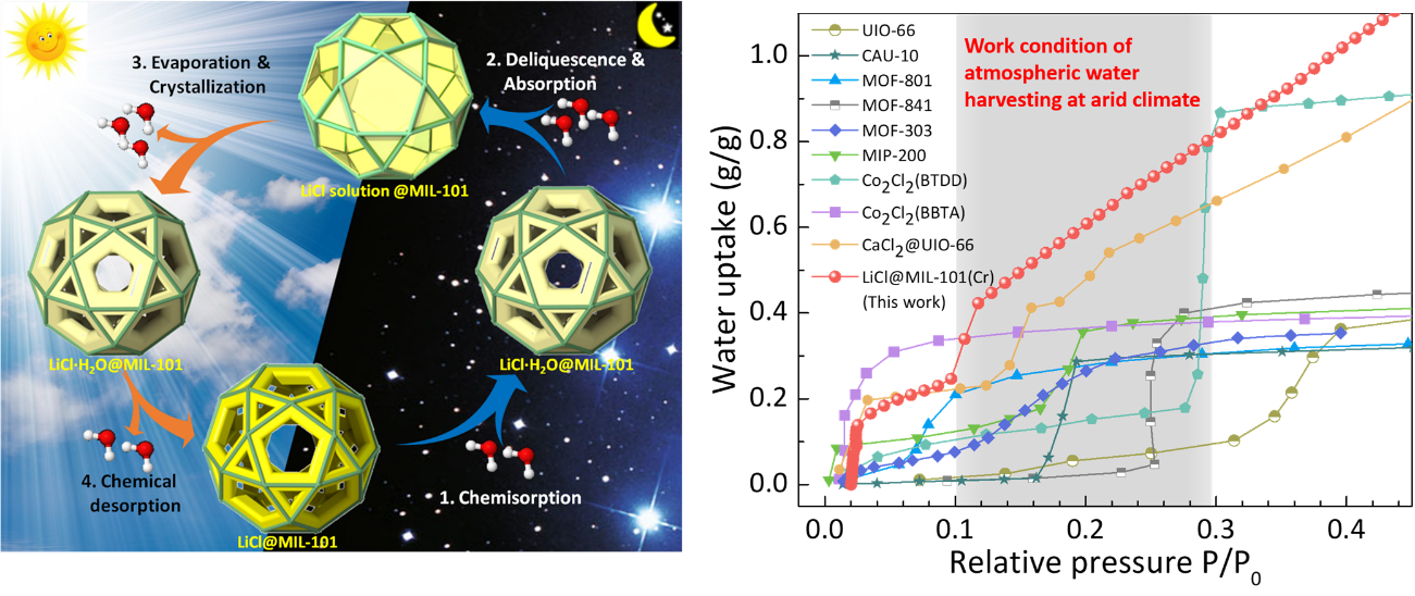 空气取水技术是解决干旱地区水资源匮乏问题的重要思路和方法,其原理是采用吸附材料吸附夜间空气中的水蒸汽,并在白天太阳能驱动作用下实现水蒸汽脱附冷凝得到液态饮用水。美国麻省理工学院和加州大学伯克利分校合作率先报道了采用MOF-801实现干旱空气取水的方法,吸附量为0.25kg水每千克MOF(Science 2017, 356, 430-434)。然而受限于目前吸附材料在低相对湿度下吸附量少的瓶颈问题,现有报道的空气取水装置取水量大多低于0.3kg水每千克吸附剂,难以进行大规模商业化应用。
