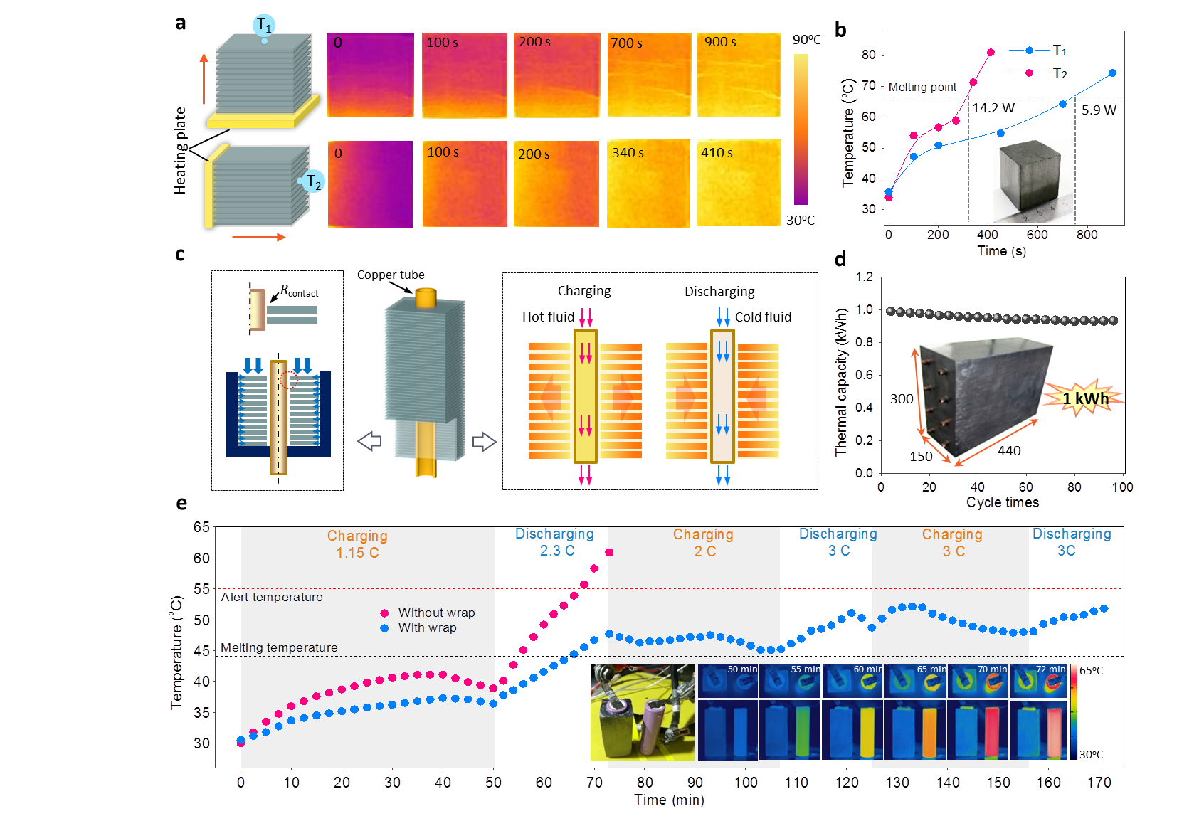在上述基础上论文还对高性能复合相变材料的应用进行了研究,提出了复合相变材料高导热方向与传热方向相互协调的热管理器件制备方法,利用石墨片层作为高导热碳翅片实现强化换热,通过将复合相变材料与换热管结合开发了1kWh高效储热器件和15kWh高效相变蓄热系统。此外,将复合相变材料用于动力电池热管理可对高倍率工作下的电池进行有效控温,延长工作时间。