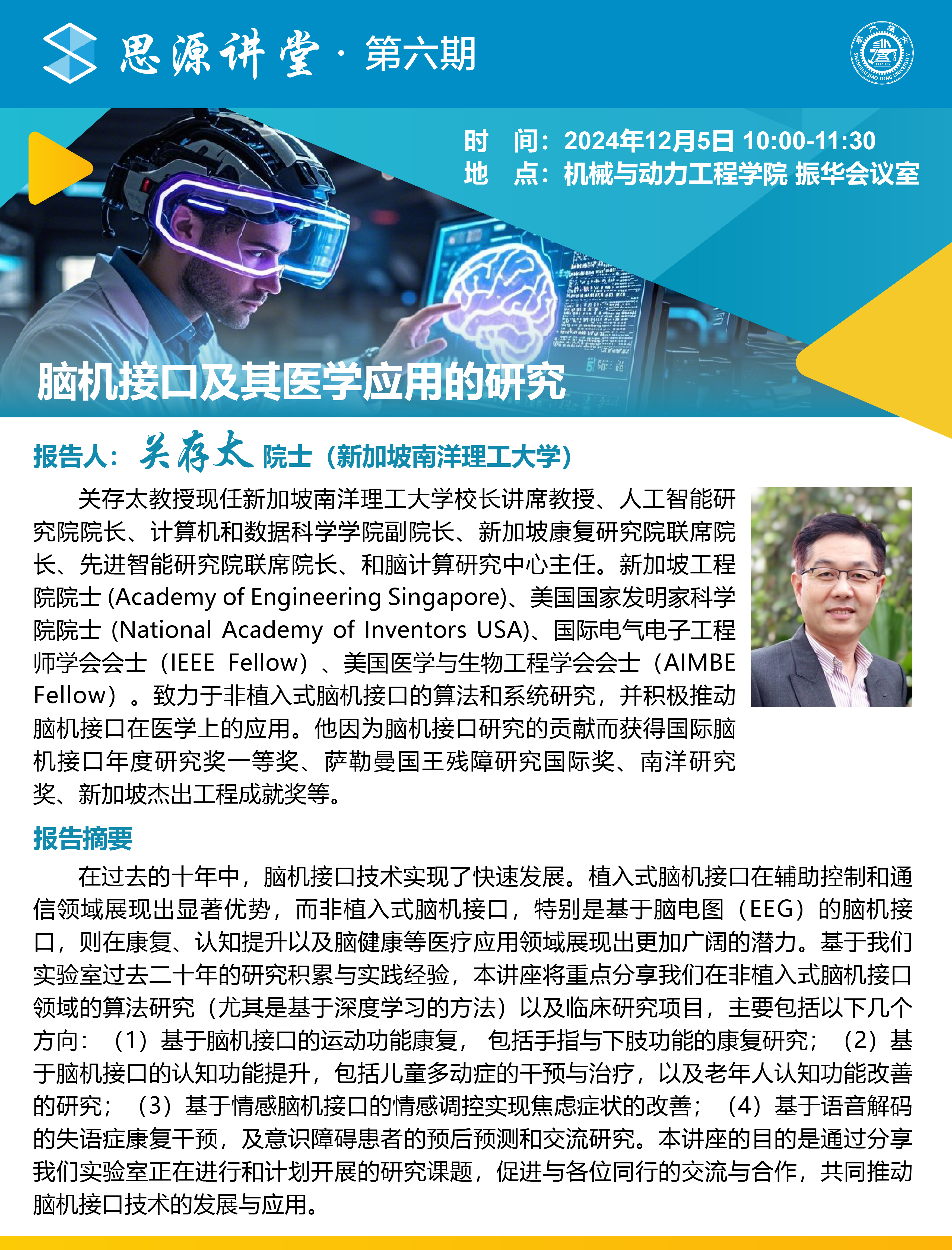 关存太教授现任新加坡南洋理工大学校长讲席教授、人工智能研究院院长、计算机和数据科学学院副院长、新加坡康复研究院联席院长、先进智能研究院联席院长、和脑计算研究中心主任。关教授是新加坡工程院院士 (Academy of Engineering Singapore)、美国国家发明家科学院院士 (National Academy of Inventors USA)、国际电气电子工程师学会会士(IEEE Fellow)、美国医学与生物工程学会会士(AIMBE Fellow)。关教授致力于非植入式脑机接口的算法和系统研究,并积极推动脑机接口在医学上的应用。他因为脑机接口研究的贡献而获得国际脑机接口年度研究奖一等奖、萨勒曼国王残障研究国际奖、南洋研究奖、新加坡杰出工程成就奖等。