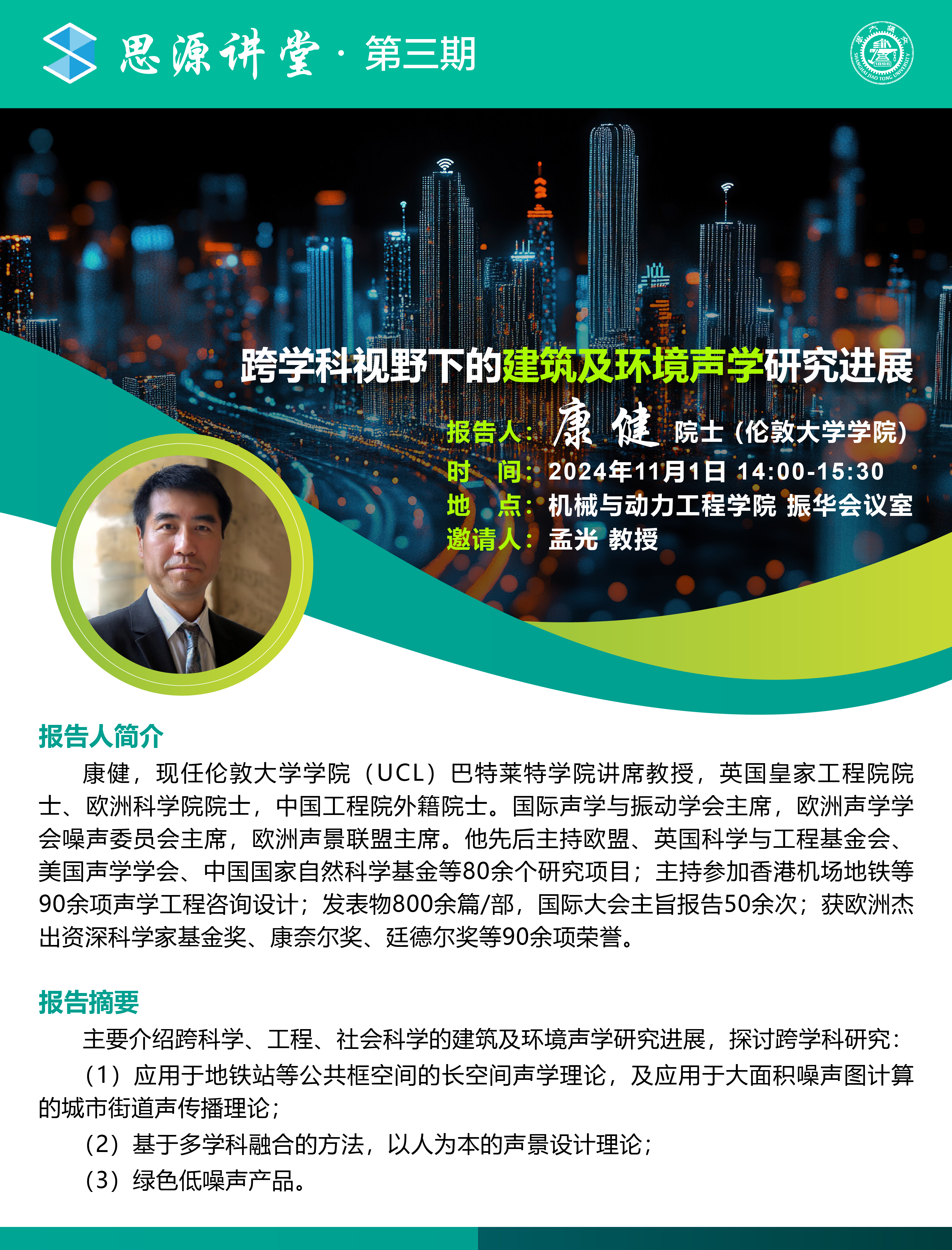 康健,现任伦敦大学学院(UCL)巴特莱特学院讲席教授,英国皇家工程院院士、欧洲科学院院士,中国工程院外籍院士。国际声学与振动学会主席,欧洲声学学会噪声委员会主席,欧洲声景联盟主席。他先后主持欧盟、英国科学与工程基金会、美国声学学会、中国国家自然科学基金等80余个研究项目;主持参加香港机场地铁等90余项声学工程咨询设计;发表物800余篇/部,国际大会主旨报告50余次;获欧洲杰出资深科学家基金奖、康奈尔奖、廷德尔奖等90余项荣誉。