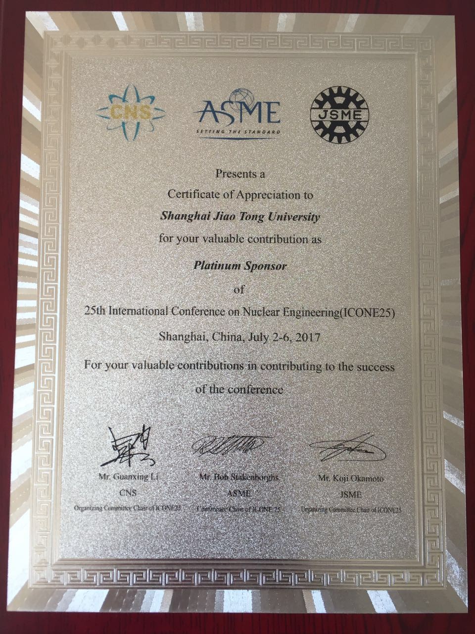 ICONE25主办方授予365best体育亚洲官网荣誉证书。