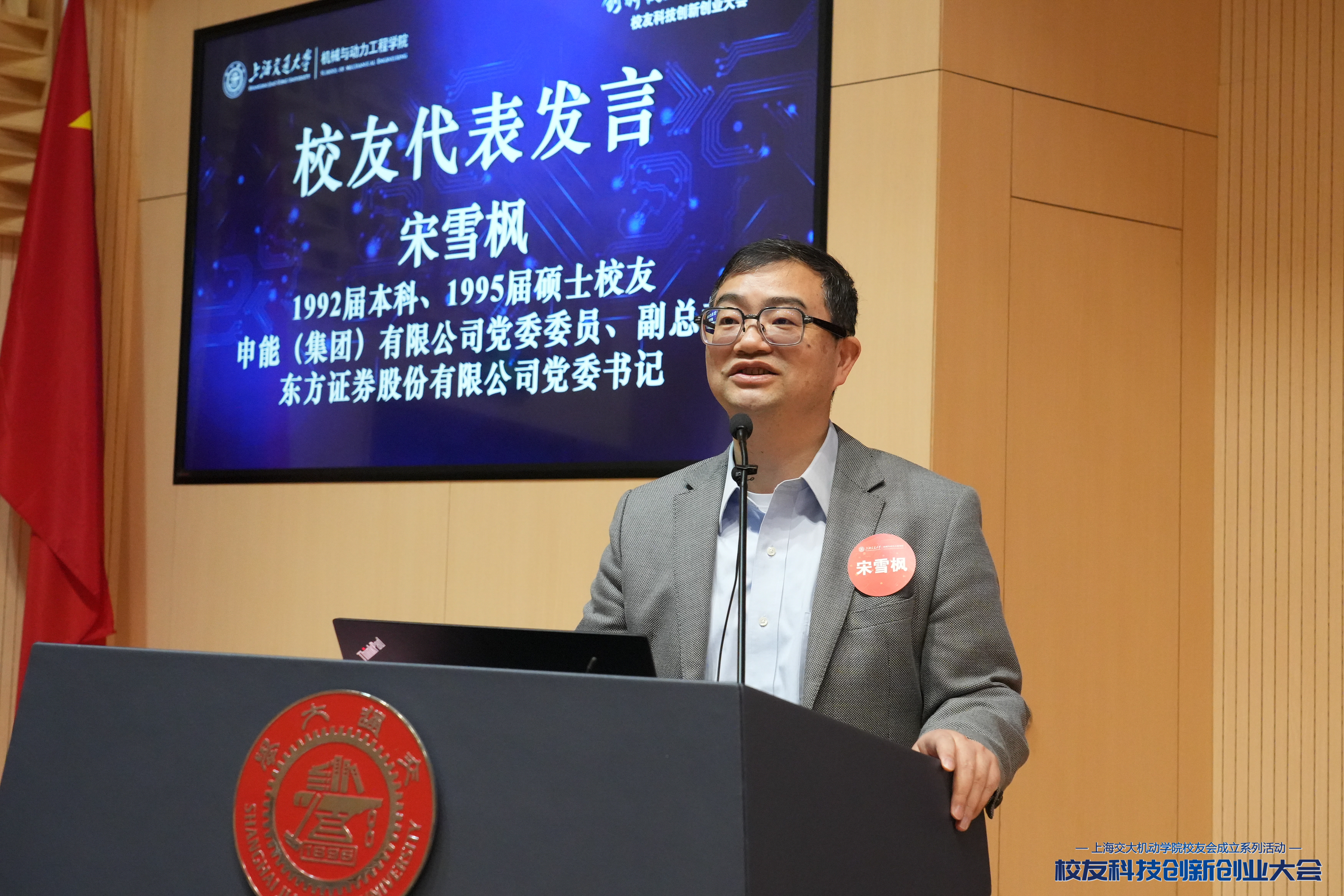 1992届本科、1995届硕士校友、申能(集团)有限公司党委委员、副总裁、东方证券股份有限公司党委书记宋雪枫回顾了个人成长和申能集团的发展,表示个人和企业的成长与国家的发展紧密相连,鼓励各位校友秉持创新开放的心态、坚持“做难而正确的事情”,勇担国家使命,共赴交大荣光。