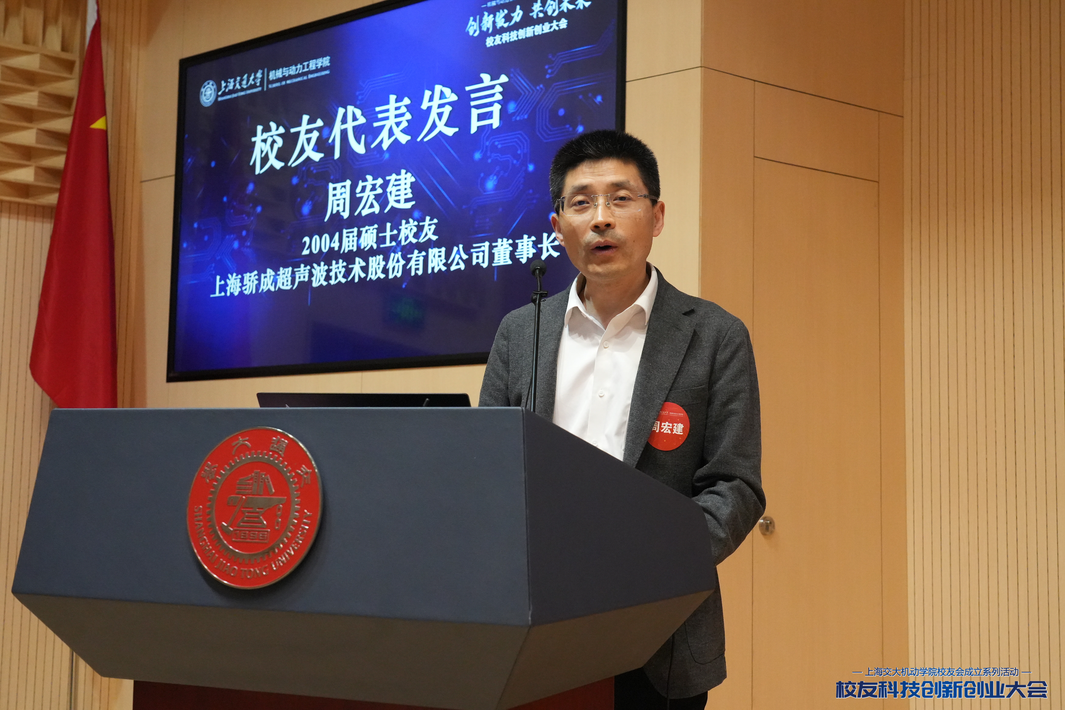 2004届硕士校友、上海骄成超声波技术股份有限公司董事长周宏建分享了自己的创业经历,从攻克“超声波裁刀”卡脖子技术开始,十余年来心无旁骛专攻主业,解决行业痛点,鼓励校友们坚持自主研发,把关键核心技术掌握在自己手中。